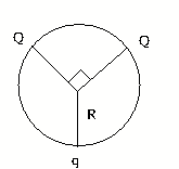 Three charges are located on the circumference of a circle of radius $R$ as shown in the figure below. The two charges \(Q\) subtend an angle \( 90^o \) at the centre of the circle. The charge \( q\) is symmetrically placed on the circumference with respect to the charges \(Q\). What is the magnitude of \(Q\) if the electric field at the centre is zero? CSIR Dec 2012 |