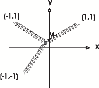 | Three massless springs of natural length $\surd 2$ and spring constant $k$ are attached to a point particle of mass $m$ and to the fixed points $(-1,1), (1,1)$ and $(1,1)$ as shown in the Fig. 1. The point mass is allowed to move in the $(x,y)$ plane only.