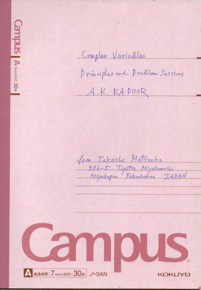 His note book has been scanned and is attached with this page for downloads. The cover page of his notebook of corrections is reproduced below. His kind words of appreciation in the accompanying letter provided me a lot of incentive and convinced me to take up the challenge of writing the solutions of problems in Part-II of the book.