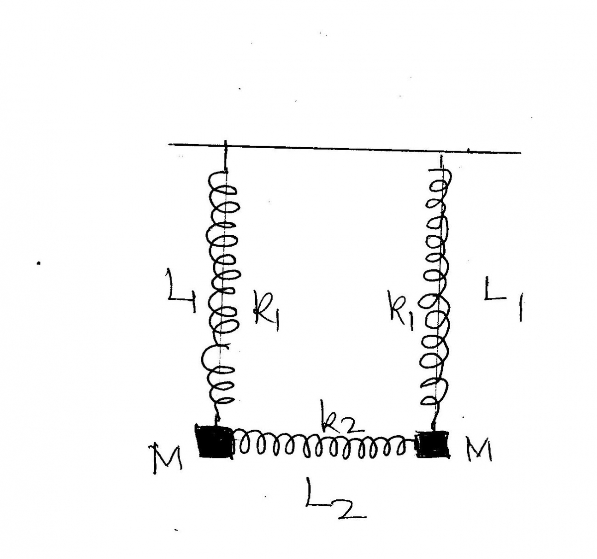 | Two equal masses, $M$, are tied to two springs hanging vertically and a third spring connects them as shown in the figures. All the three springs have natural lengths \(L\). Also in equilibrium the separation of the masses is also \(L\). Assume that the two masses are constrained to move arbitrily in the vertical plane only. What is the number o degrees of freedom of the system. Write the Lagrangian of the system ignoring the masses of the spring. | |