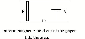 A rod of mass $m$ and length $\ell$ and resistance $R$ rests and is free to slide on two parallel rails of zero resistance as shown in \Figref{em-fig-09008}. A uniform magnetic field fills the area surrounding the rails and is perpendicular and out of the plane of the paper. A battery of of voltage $V$ is connected as shown in the figure. |