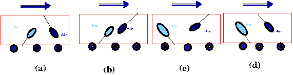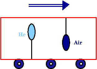 A cart carries an air balloon suspended from ceiling and a He filled balloon tied to the floor. The figure shows the situation when the cart is moving with uniform velocity. How will the two balloons appear when the cart has an non zero acceleration in the forward direction indicated in the figure by an arrow?