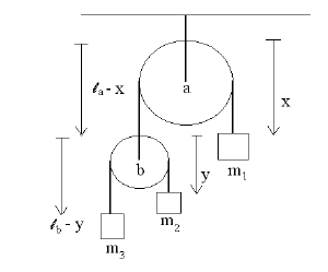 | Consider a compound Atwood machine composed three masses (labeled \(m_1 , m_2, \text{and} m_3\) ) attached by two massless ropes through two massless pulleys in a constant gravitational field with acceleration \(g\).Solve the equations of motion and show that the accelerations are given by \begin{eqnarray} \ddot{x}&=&g\left(\frac{m_1m_+-(m_+-m_-)^2}{m_1m_++(m_+-m_-)^2}\right)\\ \ddot{y}&=&g\left(\frac{2m_1m_-}{m_1m_++(m_+-m_-)^2}\right) \end{eqnarray} | ![]() |