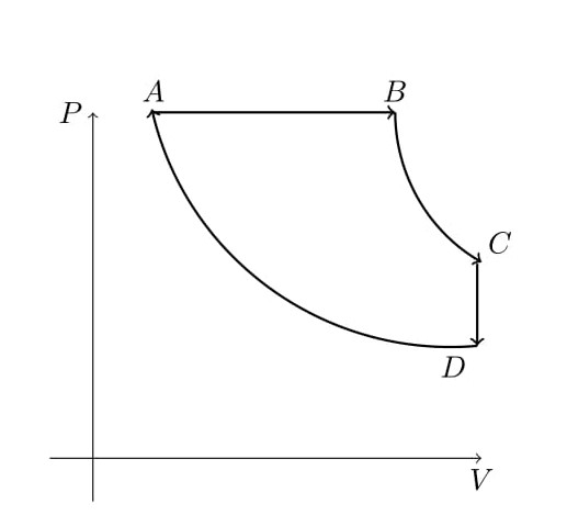 AB is constant volume BC and DA and adiabatic and CD is at constant volume. Calculate the efficiency of the engine in terms of $V_A$, $V_B$, $V_C$ and the ratio of specific heats $\gamma$. Remark : The efficency depends upon the equation of state of the system. had we used some other system ( like a gas of photons, whose equation of state, we will discuss soon) the answer is different). Only for carnot's cycle, the efficency is independent of the system.)