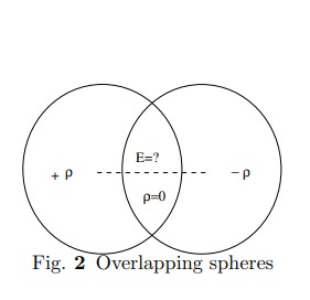 Two spheres each of radius $R$ are placed so that they partially overlap. Thecharge densities in the overlap region is zero and in the two non overlappingregions is $+\rho$ and $-\rho$ respectively as shown in figure.The separation between the centres of the spheres is $D$.Show that the electric field in the overlap region is constant.