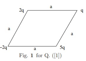 - Find the direction and magnitude of $\vec{E}$ at the center of a rhombus, with interior angles of $\pi/3$ and $2\pi/3$, with charges at the corners as shown in figure below. Assume that $ q= 1\times 10^{-8}$C, $a=5$cm