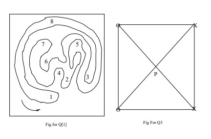 - Eight wires cut the paper perpendicularly at the points shown in figure below. A wire labeled with integer $k$ ($k$=1,2,\ldots,8) carry currents $I_k$ as given below. For those with odd $k$ the current flows up out of the paper; for those with even $k$ the current flows down into the paper. Write an expression for $\oint \vec{B}\cdot\vec{dl}$ along the closed path shown in the direction by a single arrowhead. Find the value of the line integral when the eight currents, $I_1,I_2,\ldots,I_8$, have the values 1,2,..,8 amp, respectively