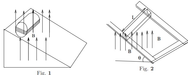 - A wooden cylinder of mass $m=0.5$kg, radius $R=3$cm, length $\ell=10$cm, is placed on an inclined plane. It has 10 turns of wire wrapped around it longitudinally so that the plane of the wire contains the axis of the cylinder and is parallel to the inclined plane, see . Assuming no friction, what is the current that will prevent the cylinder from rolling down the inclined plane in presence of a uniform magnetic field of 0.5T?. Describe what happens if the block is a rectangular instead of a cylindrical one? What will be the current that will prevent the block from moving down the plane?