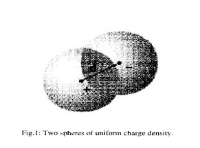 - Electric field: The spheres, each of radius $R$ and carrying uniform charge densities $+\rho$ and $-\rho$, respectively, are placed so that they partially overlap (Fig.1). $\vec{\pmb{d}}$ is the vector from the positive center to the negative center. Show that the field in the region of overlap is constant, and find its value.