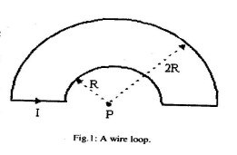 - Magnetic field using Biot-savart's law: A loop of wire has the shape of two concentric semicircles connected by two radial segments (Fig.1). The loop carries current $I$ as shown. Find the magnetic field at the point $P$ using the law of Biot-Savart.