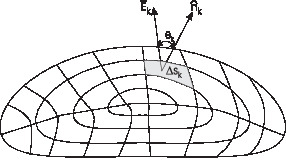 where \(\Delta\bar{S_k}\) is area of the \(k^\text{th}\) element and \(\theta_{k}\) is the angle between normal at the \(k^\text{th}\) area and the electric field at the area element.