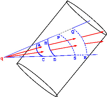 As an example of a closed surface we take a cylinder as shown in figure below. We divide the surface into large number of infinitesimal surface elements. One such element is \(PQRS\) shown in \Figref{em-fig-02023}. With the point charge as the vertex, a cone is drawn such that \(PQRS\) lies on the curved surface of the cone. This cone will intersect the closed surface in another infinitesimal element \(ABCD\). It can be seen that magnitudes of the flux through \(ABCD\) and \(PQRS\) are equal but opposite in sign. The signs are opposite because flux through \(ABCD\) will be inwards and the flux through \(PQRS\) will be outwards. Therefore, the net outward flux, through such pairs of surface elements vanishes. A closed surface can be divided into similar pairs of surface elements by cones in different directions. For each such pair the net outward flux of the field will be zero. Therefore the total flux is zero when charge \(q\) is outside. |