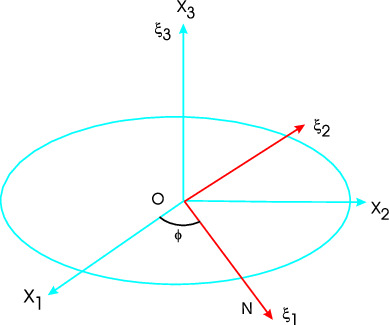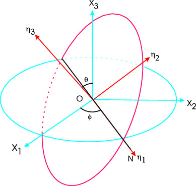 We first rotate the axes in \(K\) the about $X_3$ by angle $\phi$ to get the $\xi_1,\xi_2,\xi_3$ axes, noting that $\xi_3$ will be same as $X_3$ and now $\xi_1$ coincides with the line of nodes. (See figure below.) \paragraph*{Second rotation:} The next rotation is about the line of nodes, {\it i.e.} about $\xi_1$ by angle $\theta$, giving the new axes $\eta_1,\eta_2,\eta_3$. After this rotation $\xi_2$ axis coincides with $\eta_{12}$ and $X_3$ moves to $\eta_3$ which is the final $\equiv X_3'$ axis.