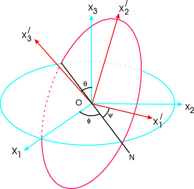 The Euler angle parametrization of rotations is very useful in visualization of the solution of the EOM for a rigid body. Let $OX_1,OX_2,OX_3$ (shown in blue) and $OX_1{'},OX_2{'},OX_3{'}$ (shown in red) be two sets of coordinate axes related by a rotation. The orientation of $K{'}$ system relative to $K$ can be completely and uniquely specified in terms of three angles called Euler angles. To define the Euler angles, consider line of intersection of $OX_1,OX_2$ and $X_1{'},X_2{'}$ planes. Let us assume that this line, called the {\it line of nodes}, makes an angle $\phi$ with $OX_1$ and an angle $\psi$ with $X_1{'}$. Let $\theta$ be the angle between the axes $OX_3$ and $OX_3{'}$. The three angles $(\phi,\theta,\psi)$ so defined are called Euler angles.