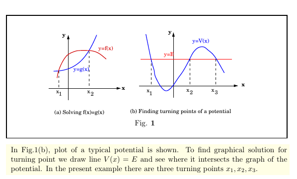 A point \(x\) where the velocity is zero is called a turning point. If \(x_0\) is a turning point, using the energy equation \(E= \frac{1}{2} mv^2 + V(x)\), we see that turning points are obtained by solving the equation \begin{equation}\label{EQ13} E= V(x_0). \end{equation} It is useful to learn how solution of \eqRef{EQ13} can be obtained graphically.