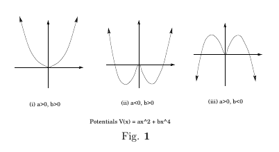 Let us look at the motion of a particle under influence of a potential \begin{equation} V(x) = \frac{1}{2}m\omega^2(a x^2-bx^4) \end{equation} We shall be interested in three cases, (i) \(a> 0, b>0\) \ (ii) \(a<0, b>0\) (iii) \(a>0, b<0\).The plot of the potential for the three cases is shown below.