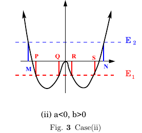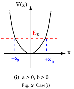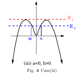 Case (ii) $a< 0, b>0$ In this case the potential is a double well potential with a maximum at \(x=0\) and two minima given by \( x_0 = \sqrt{|a/2b|}\equiv x_0\) at minimum the potential takes value \(V_0=-\frac{a^2}{2b}\).\\ For \( E>0V_\text{min},\text{and} E<0\) the motion is confined between one of the the two regions \(PQ\) or \(RS\) of the \(x\)-axis, see \Figref{3PotsB}. The the initial position of the particle is in the left well, the particle remains confined to \(-x_0 <x<0\). if= the= initial= position= is= in= right= well= it= remains= {\it= i.e.}= will= have= restricted= to= \(rs\).= for= \(e=>0\), there are two turning points and the motion is confined between \(MN\).