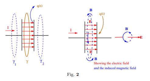 If the charge on the plates is $q(t)$ at time $t$, then the charging current is $I=\frac{dq}{dt}$. Also $\vec{E}$ and $\frac{d\vec{E}}{dt}$ are non-zero between plates. We calculate displacement current density \begin{align*} J_d = \epsilon_0~\frac{\partial E}{\partial t} = \epsilon_0~\frac{\partial}{\partial t}\left(\frac{V}{d}\right) = \epsilon_0 ~\frac{1}{dC}\cdot\frac{dq}{dt} \end{align*} where \\ $V=$ potential difference at time $t$, $V=q/C$\\ $C=$ capacitance $=\frac{\epsilon_0A}{a}$\\ $A=$ area of plates\\ $d=$ distance between plates.\\ Now consider an Amperian loop \(\gamma\) as shown in the figure. The time varying electric field produces a circulating magnetic field as shown in \Figref{??}. It will now be verified that the circulation of the magnetic field around the loop \(\gamma\) is equal to \(\mu_0 I\) in accordance with the Ampere's law. The magnetic field due to time varying electric field is given by the Maxwell's equation \begin{equation} {\nabla}\times \vec{B} =\mu_0\vec{j}+\epsilon_0\mu_0~ \frac{\partial\vec{E}}{\partial t} \end{equation} Consider the line integral \begin{align*} \int_r\vec{B}\cdot\overrightarrow{dl} =& \iint_S \bar{\nabla}\times \bar{B}\cdot\overrightarrow{dS}\\ =& \iint\left(\mu_0\vec{j}+\epsilon_0\mu_0~ \frac{\partial\vec{E}}{\partial t}\right)\overrightarrow{dS}\qquad \qquad \therefore \vec{j}=0,~\text{between the plates}\\ =& \mu_0\left(\frac{\epsilon_0}{dC}~\frac{dq}{dt}\right)A \qquad\qquad\frac{\partial\bar{E}}{\partial t}~\text{$\parallel$ to the normal}\\ =& \mu_0I,\quad \because I=\frac{dq}{dt} \end{align*} We have used $C=\epsilon_0 A/d$. This completes the demonstration that the displacement current restores the Ampere's law for time varying situations.