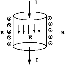 When a resister is connected to a battery, it gets heated. It will be demonstrated that the heat produced per sec equals the heat flowing in from the boundary as given by the Poynting vector $$ Heat produced per sec =I^2R = \frac{V^2}{R} $$ Let us assume that the resistance wire is of cylindrical shape with radius $a$ and length $L$ and a current $I$ flows into the wire. Due to the current a magnetic field, curling around the wire, will be created as shown.\\ The potential difference between the end points $=V$.\\ This will give rise to electric field $E=V/L$ inside the wire.\\ The direction of Poynting vector $\vec{N}=\frac{1}{\mu_0}(\vec{E}\times\vec{B})$ on the surface is into the volume of the resistance wire. The magnitude of \(\vec{N}\) will be constant all over the curved surface. Value of $\vec{N}=\vec{E}\times\vec{B}$ on the surface of wire has