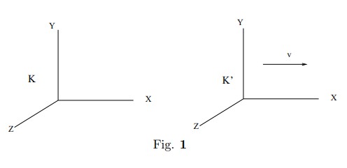 \begin{FileText}{ Let \(K\) and \(K ^\prime\) be two Lorentz frames such that \(K^\prime\) moves with velocity \(v\) w.r.t. the frame \(K\) and at initial time \(t=t^\prime=0\) the coordinate axes of the two frame coincide.
