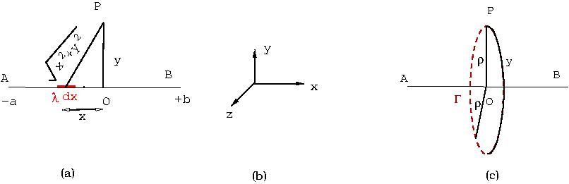 Consider a line \(AB\) on which a uniform charge \(\lambda\) per unit length has been glued. We wish to compute the electric potential at a point \(P\),see Fig.1(a). We set up a coordinate system, such that the origin, \(O\) on the line \(AB\), \(X\)- along the line. For clarity, the axes are drawn separately in Fig 1(b). The end points of the line charge are at \((a,0,0)\) and \((b,0,0)\).