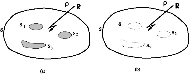 - Auxiliary charges, called image charges are placed outside region \(R\) in such a manner the potentials on the boundary \(S\) and on the boundaries of the conductors, \(S_1, S_2, S_3,...\) remains as in original problem.