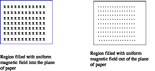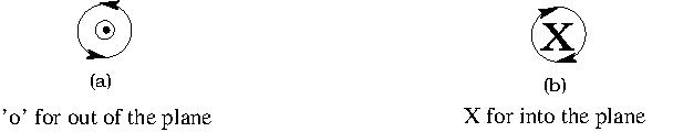 When drawn from a point two vectors define a plane. The cross product will be perpendicular to the plane containing the the two vectors. We state a convention for direction of vectors perpendicular to the plane of paper. There are two possibilities. A normal vector can be out of the plane, or into the plane of the paper. A circle with a dot. \(\odot\), or dots in a region will be used for the direction out of the plane. A cross \(\otimes\), or into sign \(\times\) will be used to indicate the direction into the plane of the paper. \\