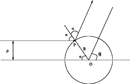 \begin{equation}\theta = \pi -2\alpha, \Rightarrow \alpha = \pi/2 -\alpha.\end{equation}Therefore the impact parameter $\rho$ is given by\begin{equation} \rho = R \sin \alpha = R \cos(\frac{\theta}{2})\end{equation}Hence the differential cross section is\begin{eqnarray} \sigma(\theta) &=& \frac{\rho}{\sin\theta} |\frac{d\rho}{d\theta}|\\ &=&\frac{R \sin(\frac{\theta}{2})R \cos(\frac{\theta}{2})}{\sin\theta} \times \frac{1}{2}\\ &=& \frac{1}{4}R^{2} \end{eqnarray} and the total cross section is found to be