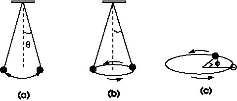 As examples of oscillation and rotation, consider a simple pendulum, Fig (a), and conical pendulum, Fig(b). Both are examples of periodic motion. In case of simple pendulum, the angle \(\theta\) varies periodically with time. It increases from zero to a maximum value then decreases to become a negative, minimum, value and then it increases. It becomes zero again after a full period. Both \(\theta\) and \(p_\theta\) are periodic functions of time. In the case of a conical pendulum, as the pendulum executes a periodic motion but the time variation of the angle \(\phi\), see Fig.(c), in not periodic. The angle \(\phi\) keeps increasing with time and never comes back to the starting value zero. The angle \(\phi\) increases linearly with time. The momentum conjugate to \(\phi\) remains constant. In general, when both modes are present the momenta will be periodic functions of time.