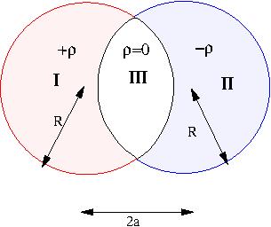 | Problem Two spheres each of radius $R$ are placed so that they partially overlap. The charge densities in the overlap region is zero and in the two non overlapping regions is $+\rho$ and $-\rho$ respectively as shown in figure. The separation between the centers of the spheres is $D$.Find the electric field in the two non-overlap regions. |