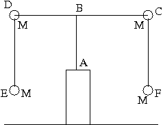 EDBCF is a rigid structure attached rigidly to the rod AB. The entire system is free to oscillate in the vertical plane about the axis perpendicular to the paper passing through A. The angles between ED and DB, between DB and AB, between AB and BC, and between BC and CF are all $90^0$. Further $AB\, =\, K\,; DB\, =\, BC\, =\, L\, ; DE\,=\,CF\,=\, L_1$.